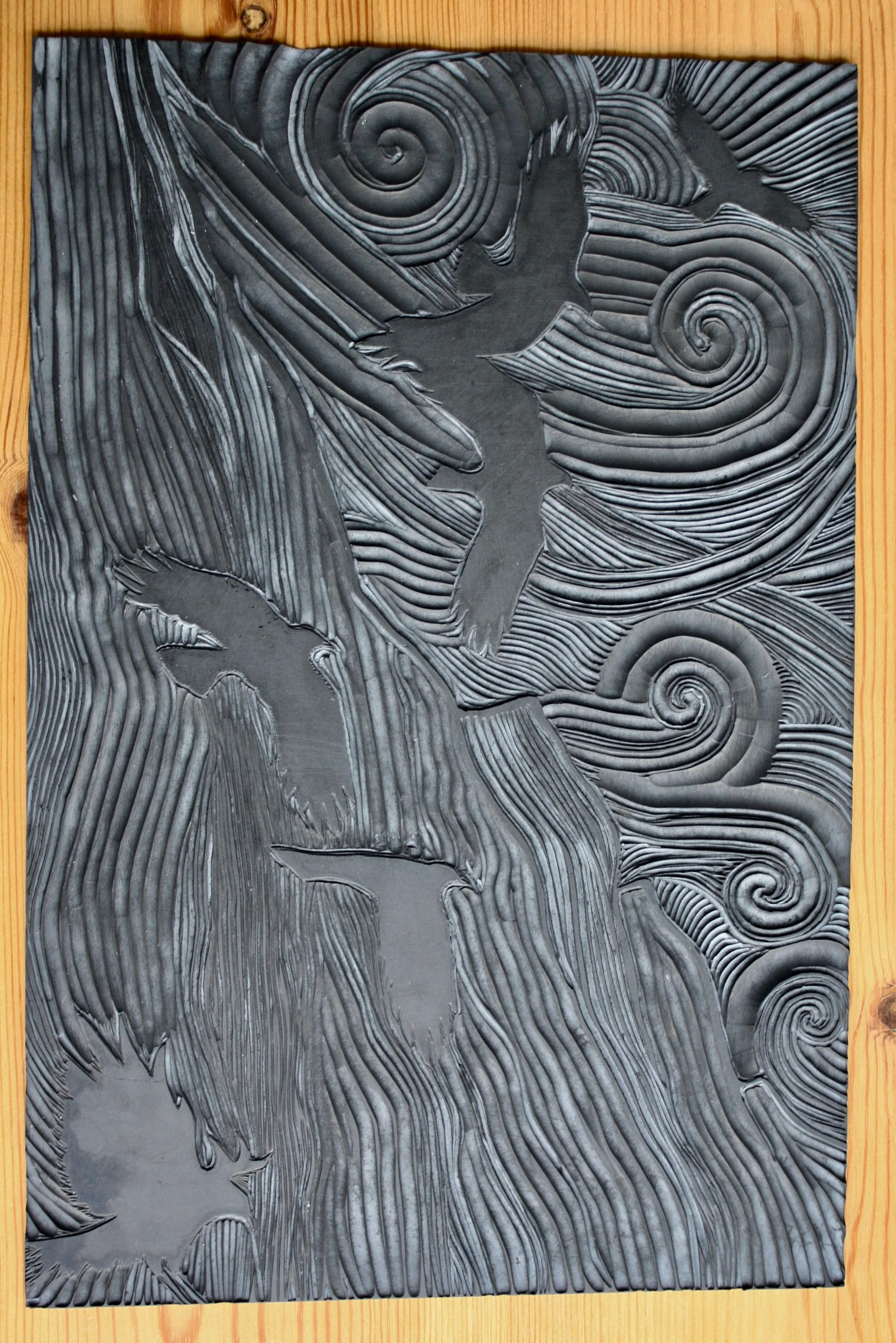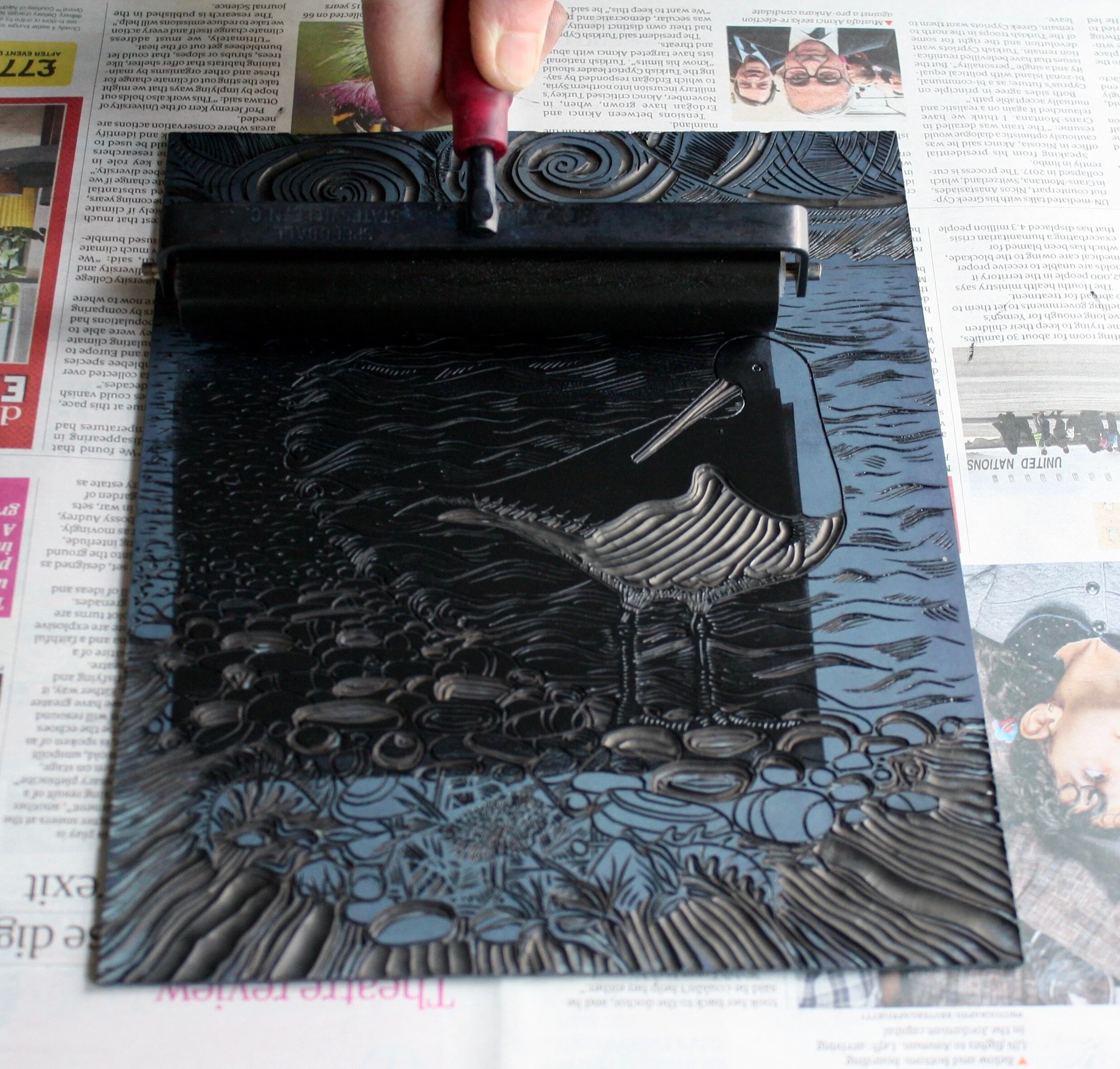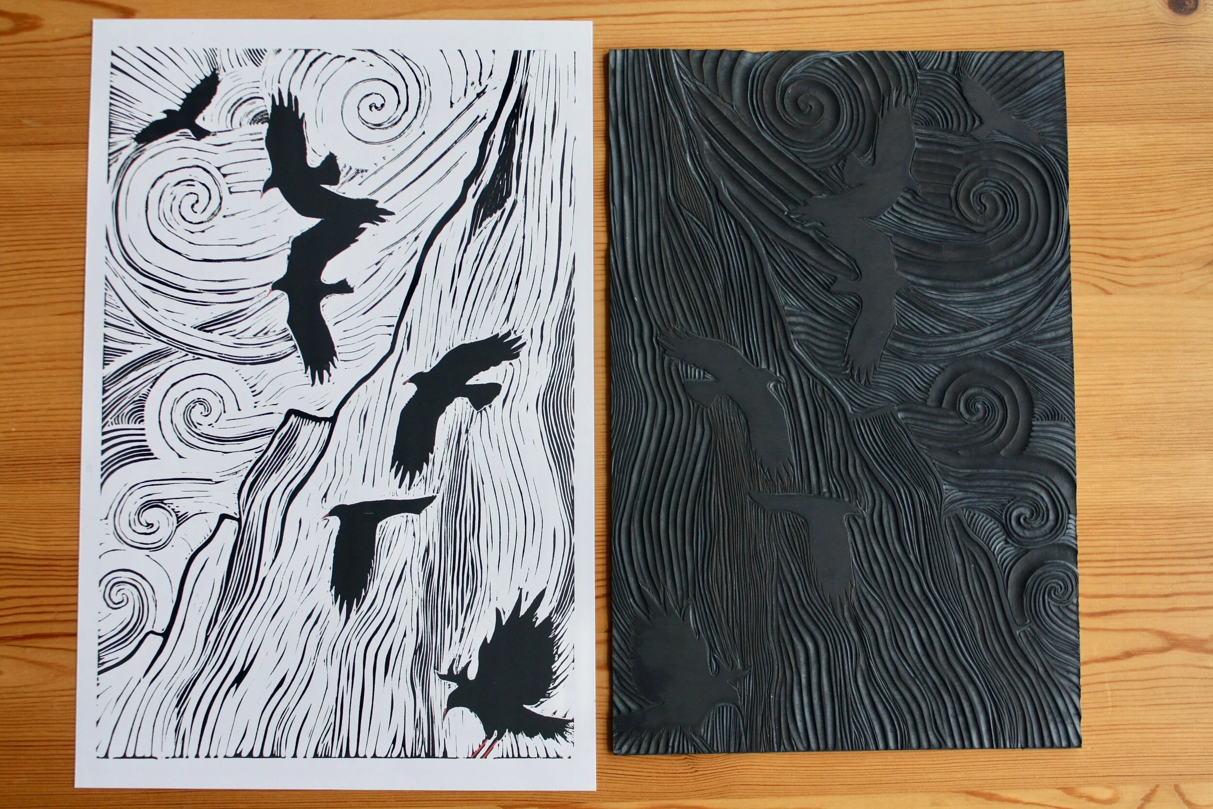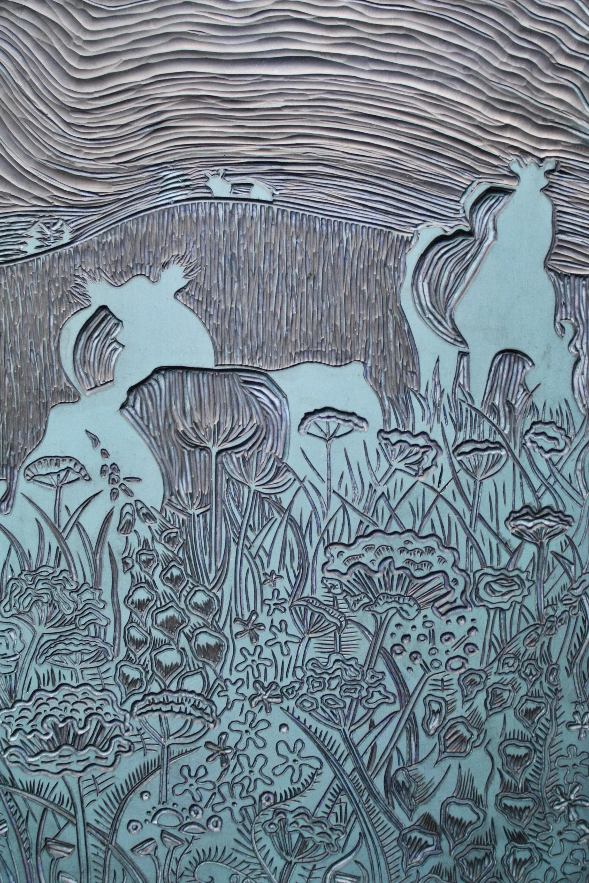 Linocut is a form of relief printing that uses linoleum as the printing block. The smooth surface allows for ease of cutting using a variety of ‘U’ and ‘V’ shaped gouges to cut lines, shapes and textures. Any part of the design not to be printed are then cut away, leaving the image raised in relief, this is then inked with a roller. The ink sits on the relief of the lino and is transferred onto the paper by rubbing on the back by hand or by using a printing press.