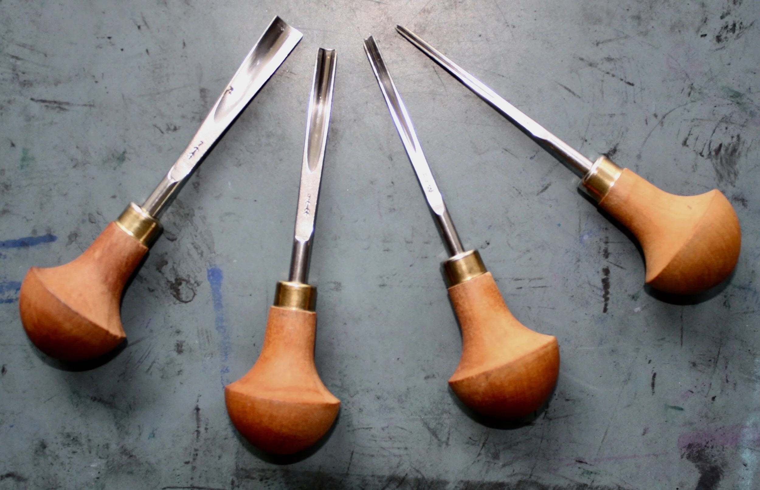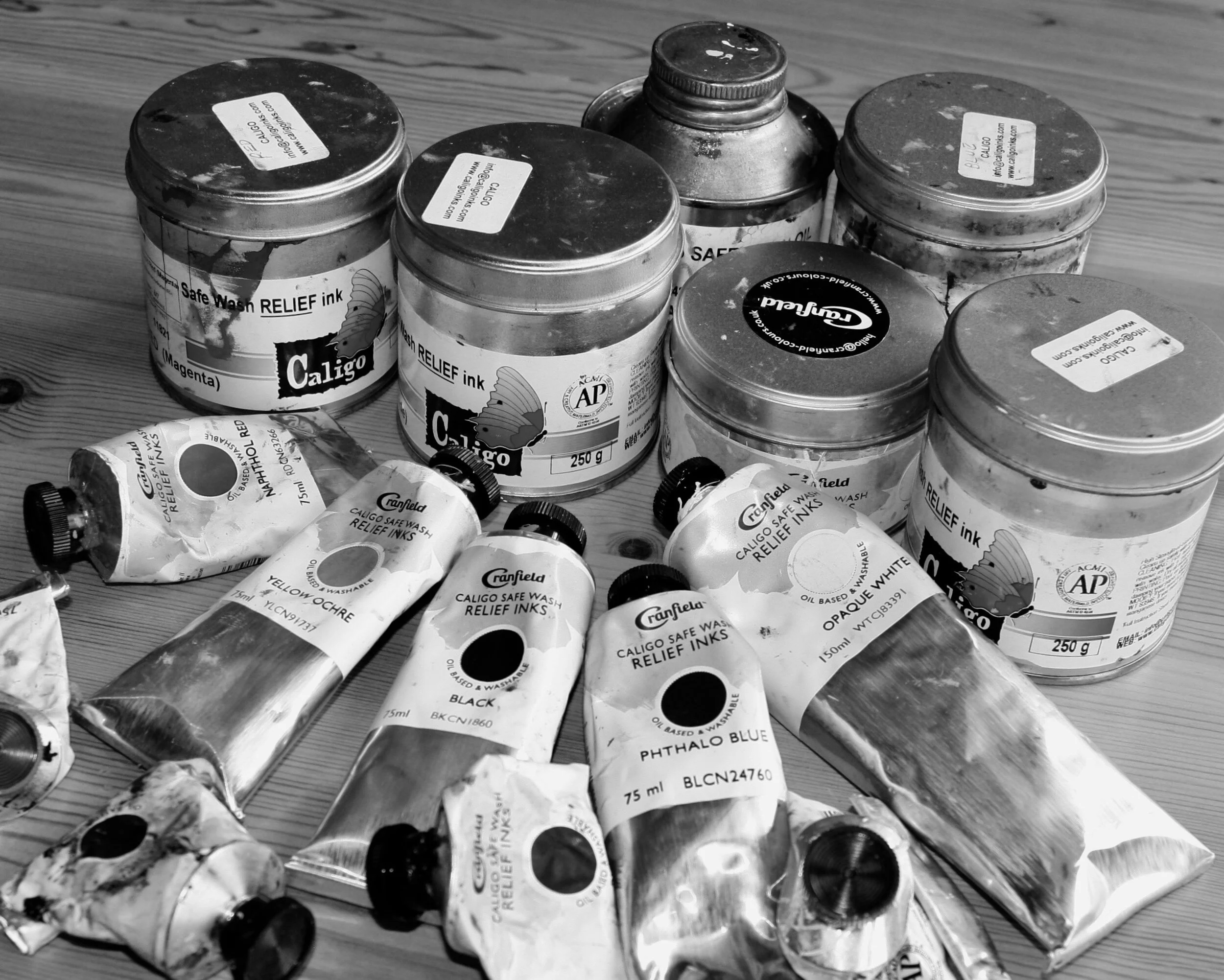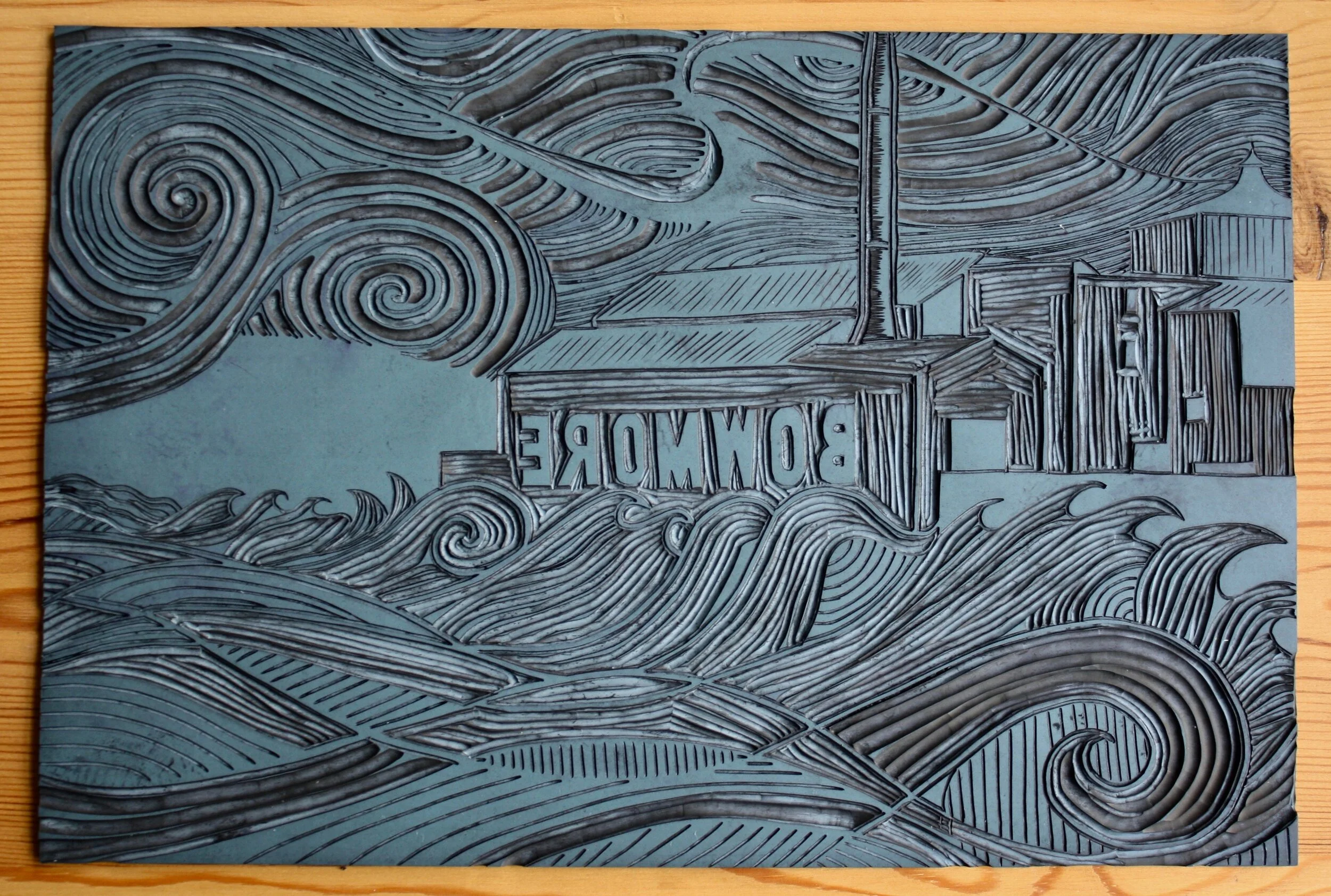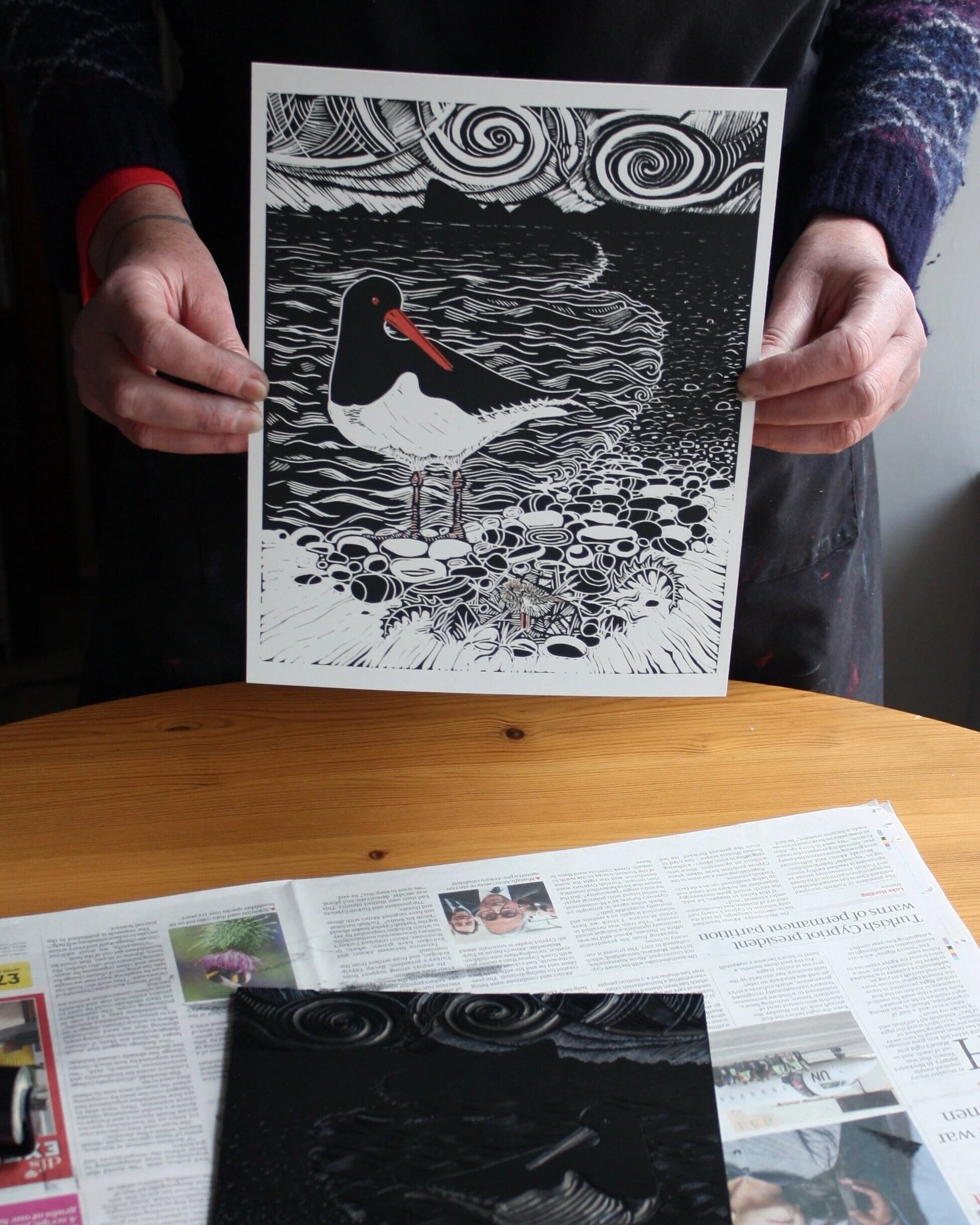 Linocut is a form of relief printing that uses linoleum as the printing block. The smooth surface allows for ease of cutting using a variety of ‘U’ and ‘V’ shaped gouges to cut lines, shapes and textures. Any part of the design not to be printed are then cut away, leaving the image raised in relief, this is then inked with a roller. The ink sits on the relief of the lino and is transferred onto the paper by rubbing on the back by hand or by using a printing press.